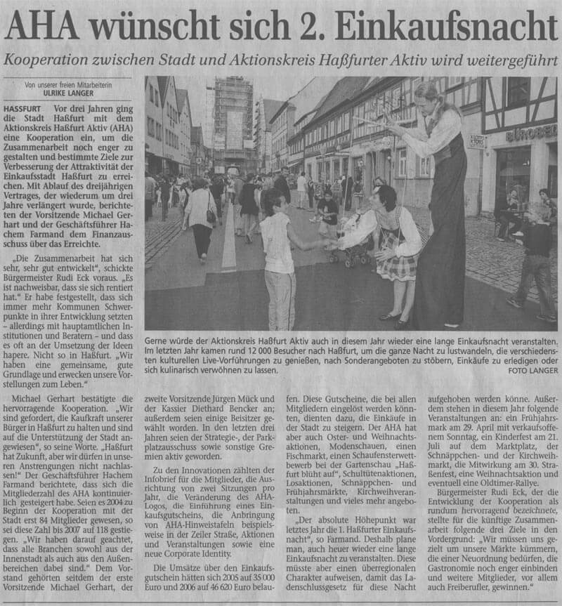 Die Einkaufsnacht, die Haßfurt ab der Dämmerung in ein wohliges Orange hüllte, wurde auch in den Geschäften zum tollen Erfolg. “Bombig“ bis “heftig“ waren die Kommentare zum Verkaufserfolg. Und ganz klar, dass der AHA die Stadtwette verlor: Die Lichterkette von Turm zu Turm klappte und der AHA muss ein Kinderfest organisieren. Quasi über Nacht wurde das jeweils am ersten Oktoberwochenende stattfindende Straßenfest in den Schatten gestellt – und das ganz ohne den aufwändigen Budenzauber. “So sollte ein Weinfest sein, in der ganzen Innenstadt“, meinte ein begeisterter Besucher angesichts des schon am kommenden Wochenende stattfindenden Weinfestes der Vereine auf dem Gries.