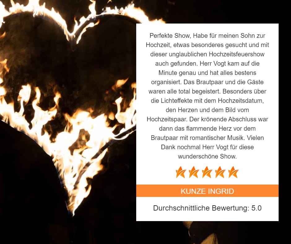 Die Kombination aus Feuer- und Lichtshow erwies sich als ein gelungene Überraschung und Highlight zur Hochzeit, welches sicherlich noch lange in Erinnerung bleiben wird. Durch die individuelle Anpassung der Show an das Brautpaar wurde das Event zu einem noch persönlicheren und exklusiveren Geschenk.