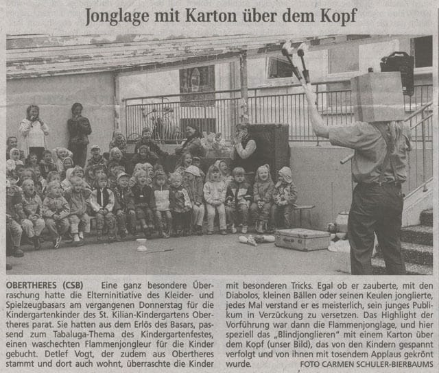 Termin: Ort: 97531 Theres – Obertheres Veranstaltung: Kindergarten Obertheres Datum: 12. Juli 2007 Uhrzeit: 10.00 Show: Jonglage und Artistikshow (geschlossene Veranstaltung)