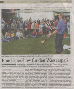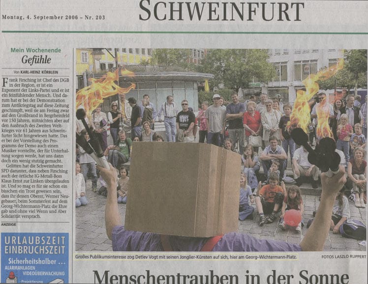 …Das perfekte Jonglieren mit Bällen und Keulen, ebenso wie mit Diabolos, brachten ihm wahre Beifallsstürme. Ein Höhepunkt seiner akrobatischen Show war zu späterer Stunde eine Feuerjonglage auf dem Marktplatz…