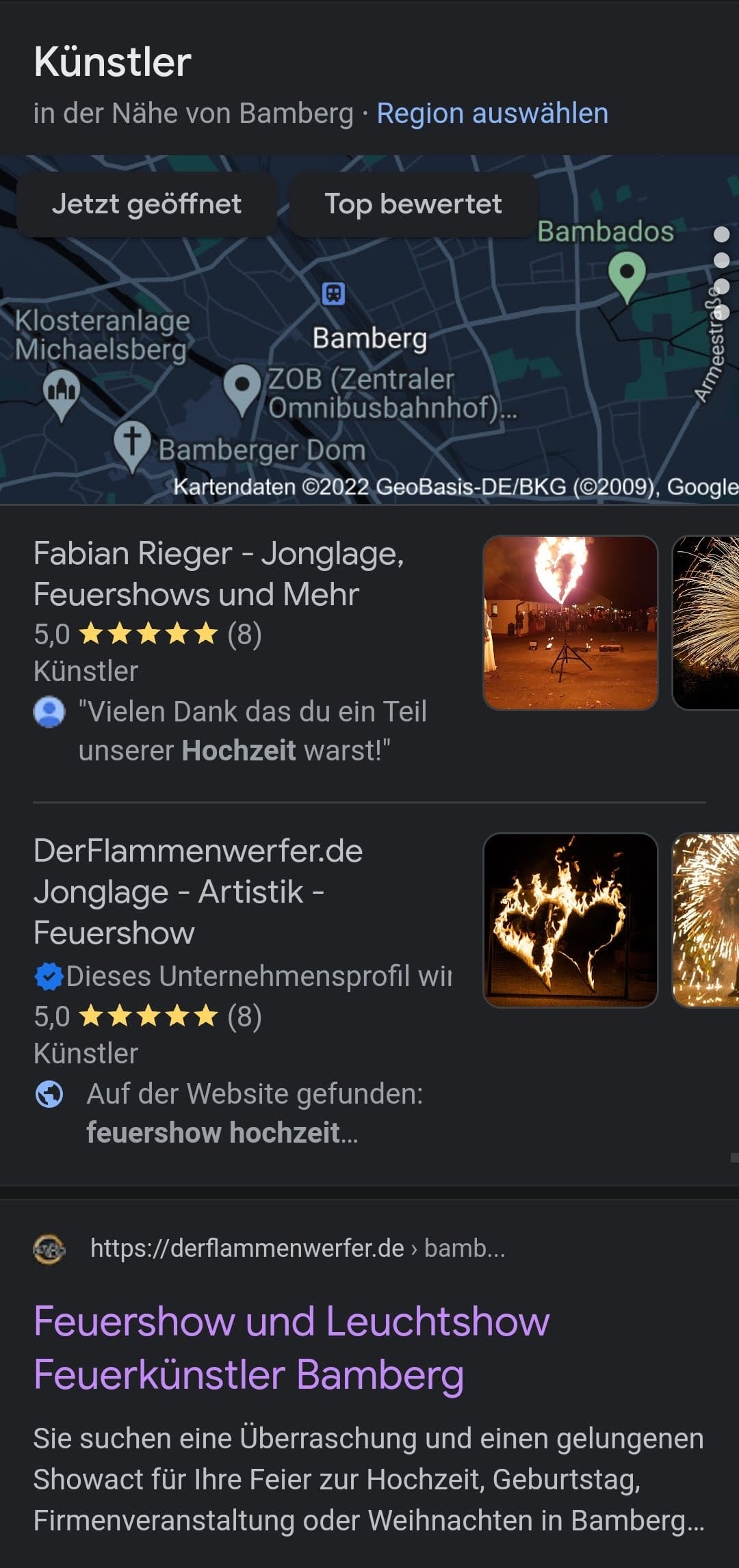Wenn Sie einen Unterhaltungskünstler benötigen, online werden Sie garantiert fündig. Suchen Sie im Internet am besten auch Lokal nach Unterhaltungskünstlern in der Gegend, in der ihr Event stattfinden soll. Dies gelingt hervorragend mit der Google – Suche oder einer Künstlervermittlungsplattform mit einer Auswahl an Künstlern. Filtern Sie hier nach Unterhaltern, die bereits bei ähnlichen Veranstaltungen wie der Ihren aufgetreten sind. Zum Beispiel könnte die Eingabe für eine „Feuershow zu einer Hochzeit in Bamberg“ bei einer Google Suche so aussehen. Auch können Sie soziale Medien nutzen, um Künstler zu finden, die für Sie infrage kommen.